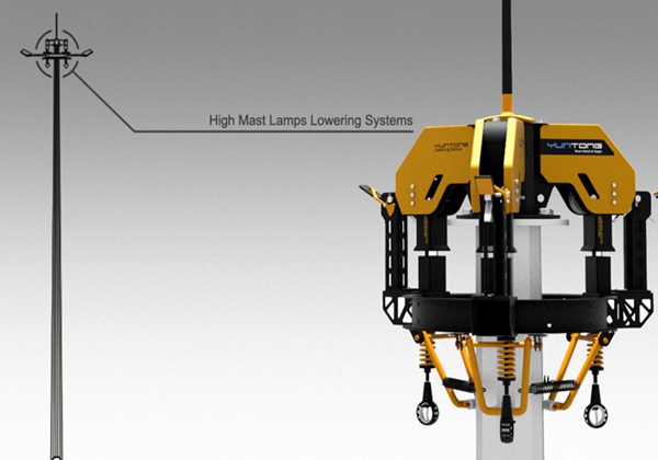 在設(shè)計升降系統(tǒng)時,主要是利用桿體底部的卷揚(yáng)機(jī),通過一根主鋼絲繩,帶動三根副鋼絲繩,主鋼絲繩的長度和副鋼絲繩的長度同高桿燈的高度大致相同,,三根副鋼絲繩的末端和高桿外側(cè)的燈盤相連接,這樣一來,主鋼絲繩在高桿燈內(nèi)側(cè),通過卷揚(yáng)機(jī)啟動后,主鋼絲繩開始往下走,將外側(cè)固定在燈盤上的三根副鋼絲繩往上拉,直到燈盤掛上高桿燈最頂端的三個掛鉤。